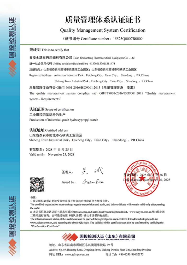 2025年11月26日,我公司羟丙基淀粉顺利通过GB/T19001-2016/ISO9001:2015质量管理体系认证。